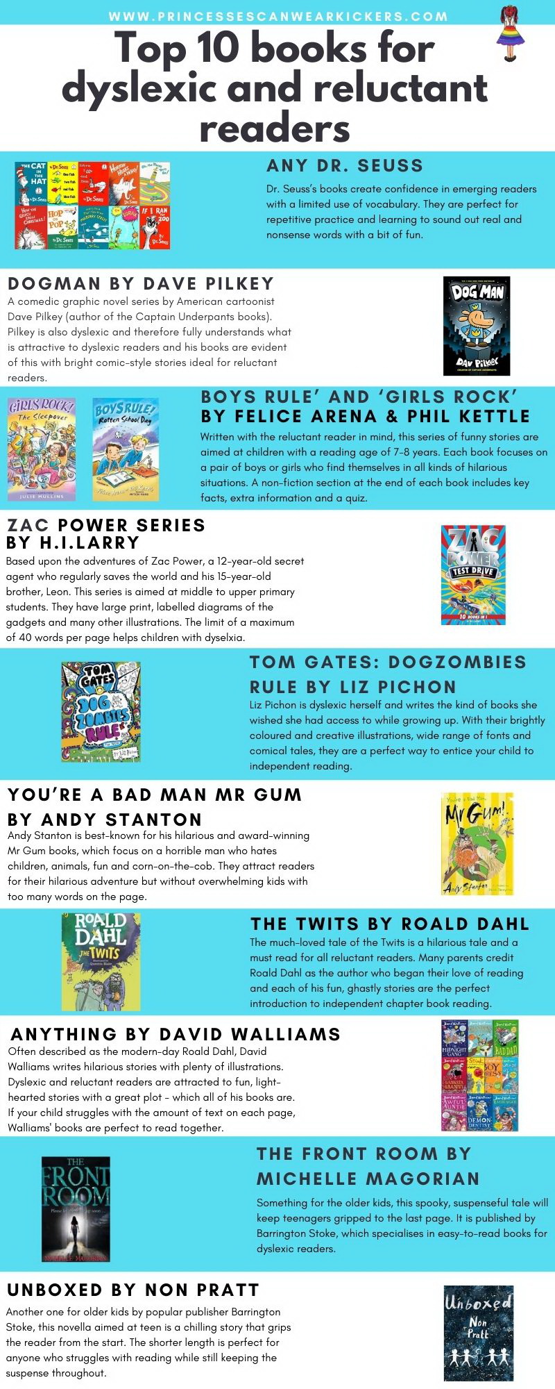 The others on the list are perfect once your child has the confidence to read by themselves. Liz Pichon, the author of the Tom Gates books is dyslexic herself and therefore knows exactly what to include when writing books for dyslexia. She knows what children want! Find the Tom Gates starter collection here (#ad)